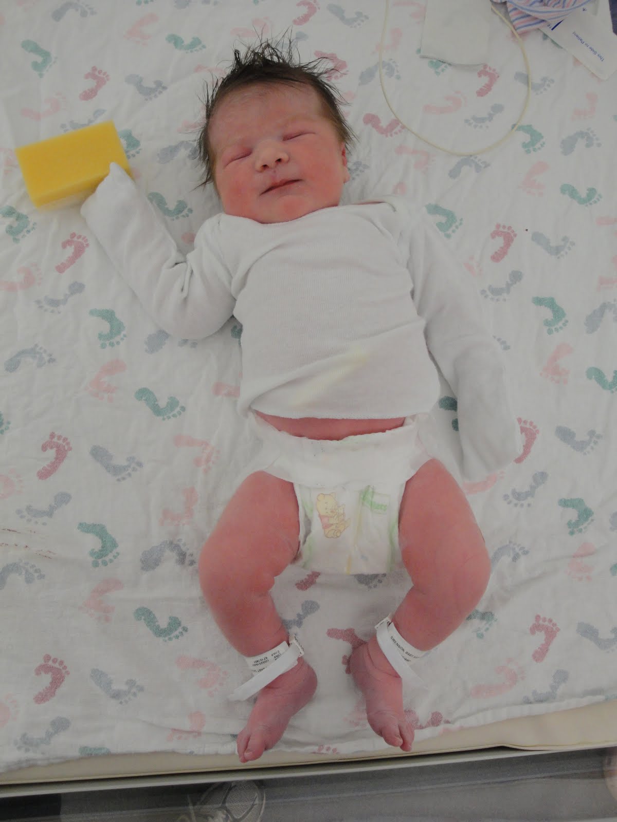 He finally came running in apologizing that he had been stuck with a patient who didn't understand that he had a woman in labor about to give birth any minute. He got suited up as fast as he could, and with the next contraction I was able to push. One push, and out she came at 3:38pm! My doctor then thanked me for not coughing or sneezing before he got there or he might have missed the birth. Alan cut the cord and then they hoisted this slimy little person up onto me. Alan and I said hello for a moment before they took her to clean her up a little. They took her just in time to, because as soon as she was off me she let loose and peed all over everything.